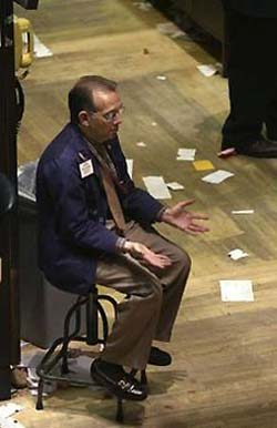 A trader sits on the floor after the closing bell at the New York Stock Exchange, October 6, 2008. The Dow dove to its lowest level in almost five years as fear gripped investors around the world. [Agencies]