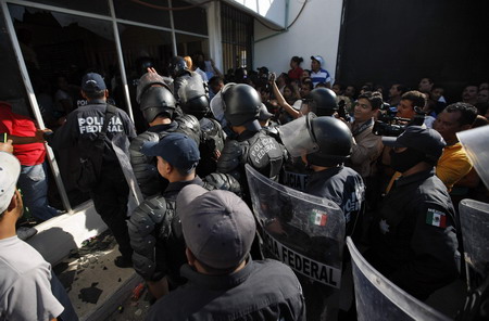 Federal riot policemen walk into a prison in preparation for a police operation to regain control of a jail in the border city of Reynosa, northern Mexico October 20, 2008. At least 21 prisoners died in a jail riot in Mexico near the Texas border on Monday when inmates from rival gangs staged a gun battle and set fire to the building. [Agencies]
