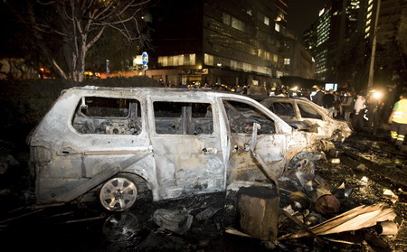 A view of the site of an aircraft crash in Mexico City November 4, 2008. Mexican Interior Minister Juan Camilo Mourino was killed on Tuesday when a small plane he was in crashed into evening rush hour Mexico City traffic. [Agencies]