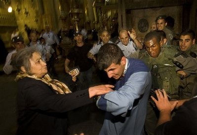 Israeli police scuffle with an Armenian monk next to the site traditionally believed to be the tomb of Jesus Christ at the Church of the Holy Sepulcher in the Old City of Jerusalem, Sunday, Nov. 9, 2008. A brawl erupted between rival monks at one of Christianity's holiest sites, and Israeli police detained two clergymen for questioning. [Agencies]