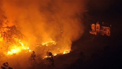 Fire approaches a mansion during a wildfire, Friday, Nov. 14, 2008, in Santa Barbara, Calif. An official in Santa Barbara County, says the fire has destroyed about 70 homes in the upscale community of Montecito. [Agencies]
