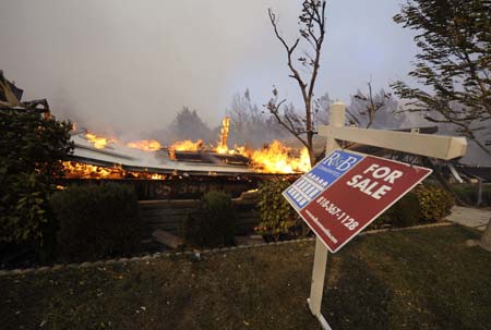 A sign blows in the wind as a home is destroyed by wildfire fuelled by strong winds in the Sylmar area of Los Angeles November 15, 2008. A fast-moving wildfire in suburban Los Angeles is a threat to the city's power supply, Mayor Antonio Villaraigosa said on Saturday.[Agencies]