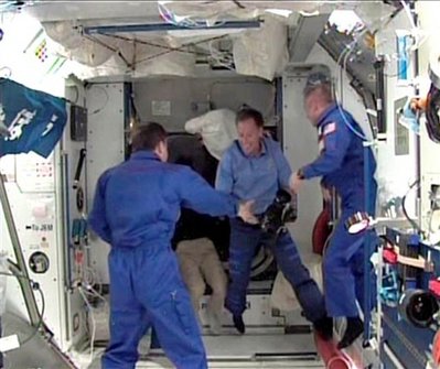 The main business of the day is unloading a cargo container nicknamed "Leonardo" from space shuttle Endeavour's belly and attaching it to the international space station. Inside the 21-foot-long container is almost 15,000 pounds of equipment that will allow the space station to expand from three to six crew members next year. "Things are going exceedingly well," said LeRoy Cain, chairman of the mission management team. Besides the extra bathroom and urine processor, Endeavour delivered an exercise machine, kitchenette and two sleeping compartments. Endeavour docked with the space station Sunday afternoon almost two days after it launched from Florida. The shuttle's crew will spend almost two weeks orbiting 220 miles above Earth at the outpost, setting up the new equipment and going on four spacewalks to clean and lubricate a solar wing-rotating joint that broke down more than a year ago. Once the hatch opened between the space station and shuttle, it looked like a family reunion. The shuttle's seven astronauts exchanged a cacophony of greetings with the station's three crew members, wrapping one another in bear hugs and shaking hands. In a long-standing tradition, a bell was rung at the station's entrance. "Sandy, welcome to your new home," space station commander Mike Fincke told astronaut Sandra Magnus, who traded places with astronaut Gregory Chamitoff as a space station crew member. After living for six months at the station, Chamitoff will return to Earth with Endeavour. Analysts on the ground continued looking at images taken during launch and right before Endeavour docked. When Endeavour pulled within several hundred feet of the space station Sunday, shuttle commander Christopher Ferguson guided it through a 360-degree backflip so Fincke and Chamitoff could take close-up photos of its thermal shielding. About 200 digital images will help NASA determine whether Endeavour sustained damage during liftoff Friday night. Shuttle officials initially thought a narrow strip of thermal blanket was yanked off during launch, but images showed the blanket remained intact. They now think the piece of debris seen coming off Endeavour or its external fuel tank during launch likely was a piece of ice, which didn't strike the shuttle. Shuttle officials can order an extra inspection if they're concerned but won't make that decision until Tuesday. The extra precautions were implemented after the space shuttle Columbia disintegrated during re-entry in 2003 over Texas, killing all seven crew members. |