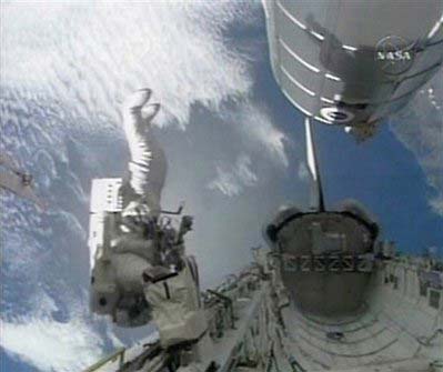 In this image from NASA TV, astronaut Stephen Bowen maneuvers down the cargo bay of the space shuttle Endeavour as he prepares to assist astronaut Heidemarie Stefanyshyn-Piper in placing an empty nitrogen tank into the shuttle's cargo bay, November 18, 2008. [Agencies]