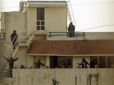 While explosions and gunfire continued intermittently at the elegant Taj Mahal hotel Friday afternoon, officials said commandos had killed two gunmen inside the nearby Oberoi hotel and ended the attack there. "The hotel is under our control," J.K. Dutt, director general of India's elite National Security Guard commando unit, told reporters, adding that 24 bodies had been found. Dozens of people - including a man clutching a baby - had been evacuated from Oberoi earlier Friday. The airborne assault on the center run by the ultra-orthodox Jewish outreach group Chabad Lubavitch was punctuated by gunshots and explosions as forces cleared it floor by floor, according to an Associated Press reporter at the scene. By Friday afternoon, the commandos had control of the top two floors. One camouflaged commando came out with a bandage on his forehead, while soldiers fired smoke grenades into the building and a steady stream of gunfire reverberated across narrow alleys. It was not immediately clear if there were hostages inside or their fate. More than 150 people were killed and 288 injured when suspected Islamic militants attacked 10 sites in Mumbai starting Wednesday evening. Security officials said their operations were almost over. "It's just a matter of a few hours that we'll be able to wrap up things," Lt. Gen. N. Thamburaj told reporters Friday morning. |