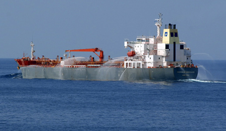 The Hong Kong flagged merchant ship M/V Overseas Hercules uses fire hoses as a countermeasure against a possible pirate attack in the Gulf of Aden December 2, 2008. According to NATO headquarters in Naples, the Italian naval destroyer ITS Luigi Durand de la Penne arrived following a distress call and instructed the vessel to use its fire hoses to thwart an attack. No attack was made on the ship. [Agencies]