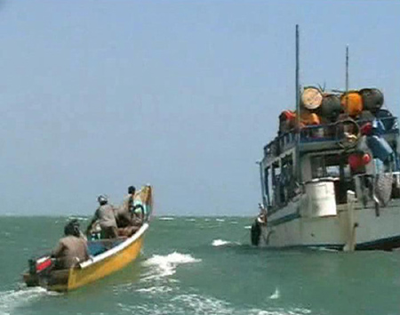 Pirates on speedboat approach one of their mother boats docked near Eyl, Somalia in this framegrab made from a November 24, 2008 TV footage. The enclave of Eyl is the homeground of pirates who are wreaking havoc on the waters off the coast of Somalia. Experts say that more than a dozen ships are still being held by pirates by the end of November, with dozens others having paid massive ransom for their freedom. [Agencies] |