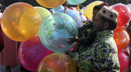 A Muslim man looks at balloons with his son outside a mosque during Eid al-Adha celebrations in the northern Indian city of Chandigarh December 9, 2008. Muslims around the world are celebrating Eid-al-Adha, marking the end of the haj, by slaughtering sheep, goats, cows and camels to commemorate Prophet Abraham's willingness to sacrifice his son Ismail on God's command. [Agencies]