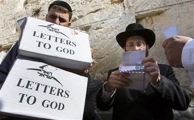 Western Wall Rabbi Shmuel Rabinowitz, right, places letters written and addressed to God into cracks in the Western Wall, Judaism's holiest site, in Jerusalem's Old City, Tuesday, December 9 2008. An Israeli rabbi and postal official have delivered hundreds of letters from across the world to their destination, the Western Wall in Jerusalem. Every year Israeli officials bring letters addressed to the wall or to God and stuff them into the cracks between the stones in the wall.[Agencies]