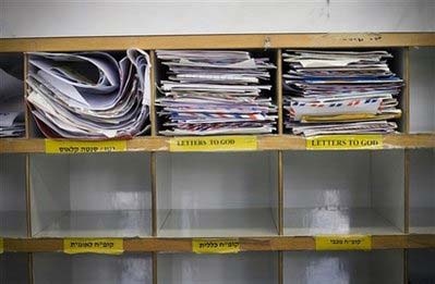 Letters from around the world addressed to God are seen piled up in shelves just before being delivered to the Western Wall, at an Israel Postal Company facility in Jerusalem, Tuesday, December 9, 2008. The sticker on the top left reads in Hebrew 'Jesus/Santa Claus'. An Israeli rabbi and postal official have delivered hundreds of letters from across the world to their destination, the Western Wall in Jerusalem. Every year Israeli officials bring letters addressed to the wall or to God and stuff them into the cracks between the stones in the wall. [Agencies]