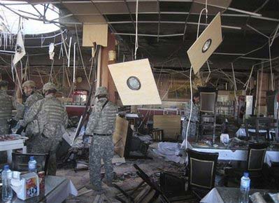 American soldiers inspect a restaurant after a suicide bomber blew himself up in Kirkuk, 290 kilometers (180 miles) north of Baghdad, Iraq, Thursday, December 11, 2008. The bomber detonated his explosives inside a popular restaurant killing at least 55 people and wounding 120 others, police said. [Agencies]