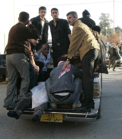 A police vehicle transports bomb attack victims to a hospital in Kirkuk, 250 km (155 miles) north of Baghdad December 11, 2008. A suicide bomber killed 55 people and wounded 120 on Thursday in a crowded restaurant near Iraq's ethnically mixed city of Kirkuk, shattering the calm during a major Muslim holiday, police said. [Agencies]
