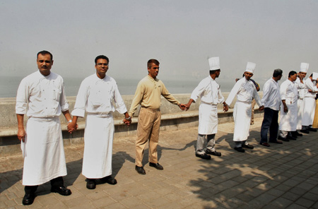 Staff of the Oberoi hotel form a human chain along with others on a street in front of the hotel in Mumbai December 12, 2008.  Thousands of Mumbai residents formed a human chain snaking through the city on Friday, protesting the devastating attacks that left at least 195 dead last month.[Agencies]