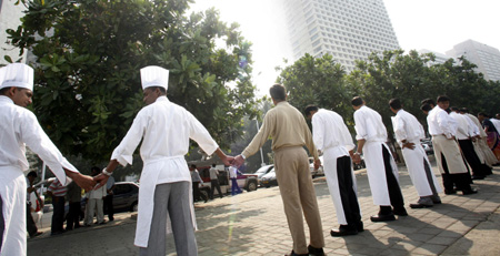 Staff of the Oberoi hotel form a human chain along with others on a street in front of the hotel in Mumbai December 12, 2008. Thousands of Mumbai residents formed a human chain snaking through the city on Friday, protesting the devastating attacks that left at least 195 dead last month.[Agencies]