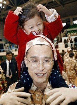 The last group of 519 soldiers who had been stationed in the northern city of Arbil and a 102-member air support unit in Kuwait arrived home earlier in the day. Prime Minister Han Seung-Soo hosted a ceremony at a military base in southern Seoul to disband the units, known as Zaytun (olive) in Iraq and Daiman in Kuwait. "Zaytun and Daiman improved the overseas operational capability of our military and significantly contributed to raising the reputation of our country," he said. South Korea sent 3,600 engineering and medical troops to Iraq in 2004, the third largest foreign troop presence at the time. It extended the deployment four times at the request of its close ally the United States but gradually cut the numbers. The unit suffered no battle casualties. President Lee Myung-Bak made a brief visit to shake hands and take pictures with soldiers. "I welcome back all members of the Zaytun and Daiman units, and I'm deeply proud of you all for helping to elevate the status of our nation abroad," Lee said in a speech. The troops provided medical services to almost 89,000 local residents and offered vocational classes to 2,299 people. They also built a variety of clinics and other public buildings. |