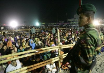 A Bangladeshi security officer (R) keeps watch at an election rally in Dhaka on December 19. Bangladesh has deployed nearly 50,000 troops across the country to avert pre-poll violence ahead of landmark elections on December 29 to restore democracy, officials said on Saturday. [Agencies]