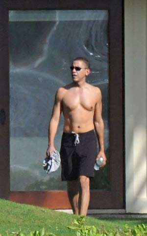 A shirtless Barack Obama and his family vacation at a beachside compound in Hawaii. [CFP]