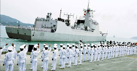 After Rear-Admiral Du Jingchen, commander of the mission, received the "go" signal from Wu Shengli, commander-in-chief of the Chinese navy, the flagship of the fleet, missile destroyer Wuhan, weighed anchor at 1:45 pm.