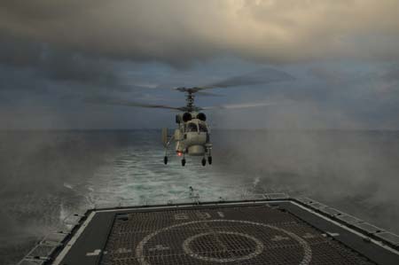 A helicopter of the Chinese naval fleet attends a landing exercise at night on December 28, 2008, while the Chinese naval fleet heads for the Gulf of Aden. The Chinese naval fleet including two destroyers and a supply ship set off on December 26 for waters off Somalia for an escort mission against piracy. [Xinhua]