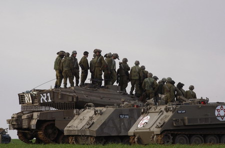 Israeli soldiers stand atop a tank outside the central Gaza Strip December 30, 2008. Israel hit the Gaza Strip with more air strikes on Tuesday and said its military action could last weeks, while rockets fired by Islamist Hamas struck deep inside the Jewish state. [Agencies]