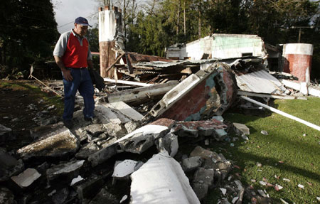 Gerardo Quesada walks in front his collapsed home after an earthquake in San Pedro de Poas, 40 km (25 mi) north of San Jose January 8, 2009. A strong 6.1-magnitude earthquake struck Costa Rica on Thursday, killing two children who sold candy to tourists in a national park and damaging buildings in the capital. [Agencies]