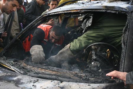 Local Radio stations quoted witnesses as saying that earlier on Sunday evening, Israeli warplanes struck the Hamas-run ministry of culture in the center of Gaza City, and a 4-story house was also destroyed by an air-to-ground missile. The radios, which are the only means of communication among the population, reported that Israeli airstrikes didn't stop strikes on the Gaza Strip during the daily three-hour humanitarian cessation. The Popular Front to Liberate Palestine (PFLP) Radio station reported that the incident that made the 16th day of the Israeli war on the Gaza Strip significant, was the ground incursion into the southwestern neighborhoods of Tal el-Hawa and Sheik Ejllin. Witnesses said that several Israeli army tanks and armored vehicles rolled about three kilometers into the two neighborhood, adding that the area witnesses a fierce and violent confrontations between Israeli soldiers and Gaza militants. Hassanein said that at least 12 Palestinians were killed during the few-hour ground operation into the two areas of Gaza City. Witnesses said that 12 militants and two civilians were killed, and dozens were injured. The witnesses said that one of the two civilians were killed in Tal el-Hawa neighborhood was a two-year old child and the other was 21 years old. The PFLP Radio station reported that as the Israeli ground forces were attacking southwestern Gaza City, Israeli warplanes and tanks intensified strikes and shelling allover the entire Gaza Strip. From overnight till Sunday morning, at least 12 were killed in separate airstrikes and tank shellings in northern Gaza Strip, eastern Gaza City and the east Khan Younis in the southern Strip, said local witnesses. Israeli aircraft bombed over 60 Hamas targets throughout Gaza Strip overnight, including the house of Ahmed Ja'abri, the top commander of the Hamas armed wing. Ja'abri has been evacuated earlier and is believed to be hiding together with other Hamas leader. Meanwhile, several Israeli tanks rode into densely-populated area of southern Gaza City on the beach of the Strip. Heavy clashes took place between Israeli soldiers and Hamas militants. Witnesses said after the confrontation, the Israeli tanks retreated back. Hassanein gave an updated figure of the casualties of the Palestinians since the beginning of the Israeli operation called " Cast Lead" that started in December 27, saying that 901 people were killed, and 3,695 wounded. |