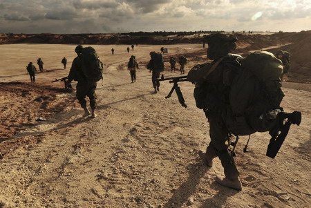 In this photo released by the Israeli Defence Forces (IDF), Israeli soldiers walk towards the northern Gaza Strip January 12, 2009. An Israeli military spokesman said army reservists had been thrown into the campaign that Israel launched with the declared aim of ending cross-border rocket attacks from the Hamas-ruled territory to its south. [Agencies]