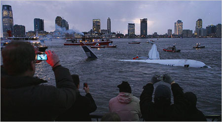 Bystanders watched as a US Airways plane drifted after ditching into the Hudson River on Thursday. [Agencies]