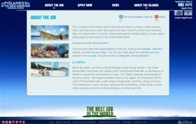 The job, which offers a salary of $105,000 to spend six months on the Great Barrier Reef island of Hamilton, has been inundated with hundreds of thousands of prospective candidates. An official from the state of Queensland, which is offering the position, said the job was created as an antidote to the global economic slump and was being advertised in 18 countries including the United States and China. Local media said technicians had to restore the website (www.islandreefjob.com) after it could not cope with the volume of interest and crashed for several hours. Some sections are still not up and running. Duties for the so-called "best job in the world" include feeding ocean fish, cleaning a pool and collecting deliveries of mail that arrive by plane. The successful candidate will have to go scuba diving, snorkeling and hiking and enjoy at least 25 nearby island resorts. Thrown in is a luxury three-bedroom home and transportation to and from the island. No skills, nor experience is needed, and there is no age requirement. The job starts in July. |