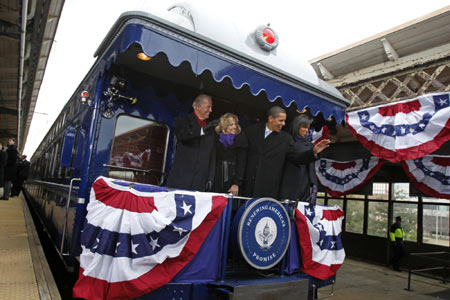 US President-elect Barack Obama (2nd R), his wife Michelle (R), Vice President-elect Joe Biden (L) and his wife Jill look out from the back of their train at a station in Wilmington, Delaware, January 17, 2009. They are on a train trip to Washington to kick off several days of inauguration festivities with Obama being sworn in as the 44th President of the United States on January 20. [Agencies]
