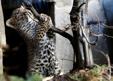 Baby Leopard, Wei plays at the Jardin des Plantes zoo in Paris, Monday January 19, 2009. Wei and his brother Xun, not seen, were born on November 30, 2008. [Agencies]