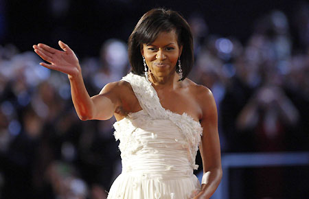 Updated: 2009-01-21 10:43 WASHINGTON -- First lady Michelle Obama chose a white chiffon one-shoulder gown for a series of balls celebrating the inauguration of her husband.