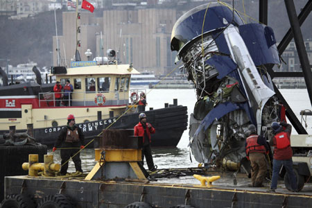 Using a large, floating crane, salvage crews gently set the engine on a barge. Shards of metal and wiring hung from the engine, and a large portion of the outer shell appeared to be missing as it was lifted from the river bottom, 65 feet below the surface. Immediately after the engine was set down, National Transportation Safety Board investigators began documenting and photographing it as part of their probe into the plane's remarkable landing.