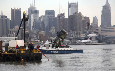 The left engine of the US Airways jetliner that crash landed in the Hudson River last week is lifted out of the water in New York January 23, 2009. [Agencies]