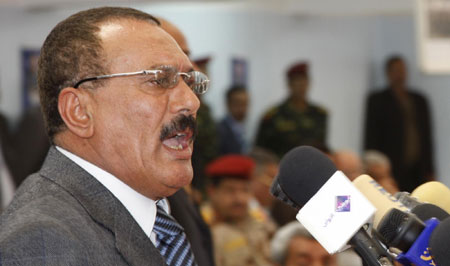 Yemen's President Ali Abdullah Saleh addresses a gathering of tribal leaders in the north-central province of Marib February 3, 2009. Saleh called on tribesmen on Tuesday to hand over al Qaeda militants, saying violence was jeopardising development. [Agencies]