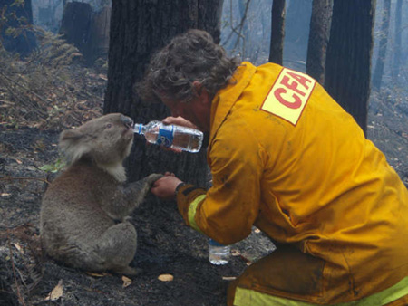 A koala named Sam is given a drink of water by Country Fire Authority volunteer fire fighter Dave Tree after he rescued her following deadly fires that swept through the area of Mirboo North, about 120km (75 miles) southeast of Melbourne, February 8, 2009. Sam, a bewildered and badly burned koala, has emerged from the ashes of Australia's deadliest bushfires, a small beacon of hope after days of devastation and the loss of more than 180 lives. Picture taken February 8, 2009. [Agencies]