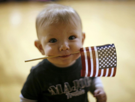 Dylan Curry, 11 months old, carries a US flag in his mouth as he waits for his US Army soldier father to return from Iraq before a ceremony at Fort Carson in Colorado Springs, Colorado February 12, 2009. About 280 soldiers from the 3rd Brigade Combat Team, 4th Infantry Division returned following their 15-month deployment to Iraq. [Agencies]