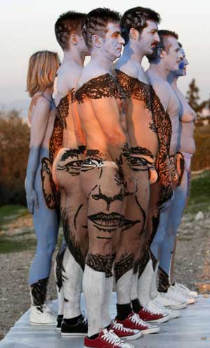 Body-painted performers stand in formation to depict the face of U.S. President Barack Obama during "The fall of Athens" performance by Swiss artist Dave at Filopapou hill in Athens Feb. 16, 2009. The ceremony was part of the Art Marathon, which will be travelling around the globe until December 2050. [Agencies]