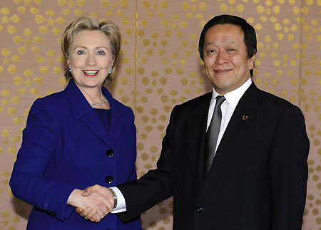 US Secretary of State Hillary Clinton (L) shakes hands with Japanese Defence Minister Yasukazu Hamada at the start of their talks at the Iikura Guest House in Tokyo February 17, 2009.[Agencies]