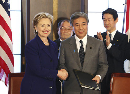 US Secretary of State Hillary Clinton (L) smile with Japan's Foreign Minister Hirofumi Nakasone (2nd R) after signing of agreement for US Marines to move to Guam at the Iikura Guest House in Tokyo February 17, 2009. [Agencies]