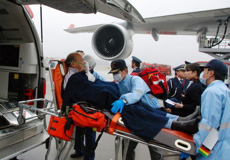 An injured passenger is carried by emergency workers at Narita Airport in Chiba Prefecture near Tokyo February 20, 2009. About 50 people were injured when a Northwest Airlines flight from Manila to Tokyo hit turbulence on Friday, a fire department official said. [Agencies]