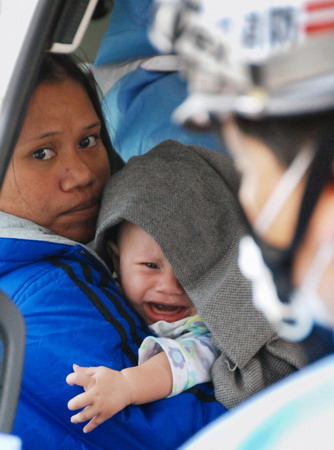 A baby cries in an ambulance at Narita Airport in Chiba Prefecture near Tokyo February 20, 2009. About 50 people were injured when a Northwest Airlines flight from Manila to Tokyo hit turbulence on Friday, a fire department official said. [Agencies]