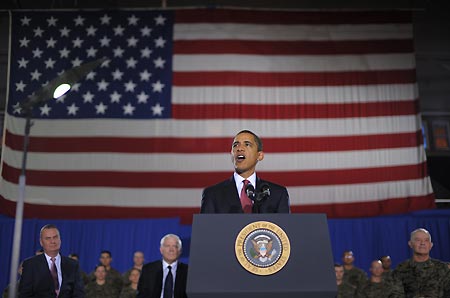 President Barack Obama speaks about combat troop level reductions in Iraq as he addresses military personnel at Marine Corps Base Camp Lejeune, N.C., Friday, Feb. 27, 2009. [Agencies]