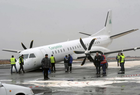 Airport workers stand around a Romanian Carpatair Saab 2000 plane following an emergency landing after developing trouble with its landing gear at "Traian Vuia" airport in Timisoara, western Romania February 28, 2009. All 47 passengers and 4 crew escaped safely.[Agencies]