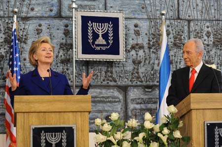 Israeli President Shimon Peres (R) and visiting U.S. Secretary of State Hillary Clinton hold a joint press conference in Jerusalem March 3, 2009. [Agencies]