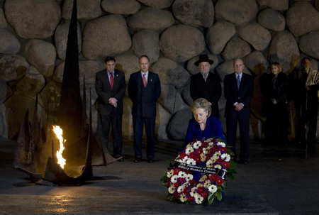 US Secretary of State Hillary Clinton lays a wreath during a ceremony in the Hall of Remembrance at Yad Vashem Holocaust Memorial in Jerusalem March 3, 2009. [Agencies]