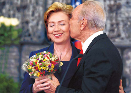 Israeli President Shimon Peres kisses US Secretary of State Hillary Clinton on her cheek as he gives her a bouquet of flowers at the end of a joint press conference after their meeting in Jerusalem Tuesday. [Agencies]
