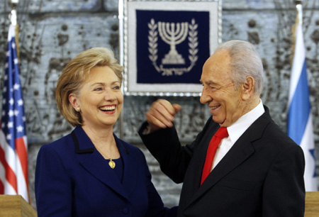 Israel's President Shimon Peres (R) stands with US Secretary of State Hillary Clinton after their meeting in Jerusalem March 3, 2009. [Agencies]