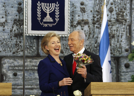Israel's President Shimon Peres (R) gives flowers to US Secretary of State Hillary Clinton after their meeting in Jerusalem March 3, 2009. [Agencies]
