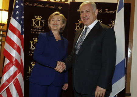 Israel's Likud party leader and prime minister-designate Benjamin Netanyahu (R) shakes hands with US Secretary of State Hillary Clinton before their meeting in Jerusalem March 3, 2009. Clinton pledged on Tuesday to press hard for Palestinian statehood, putting Washington on a possible collision course with Netanyahu. [Agencies]